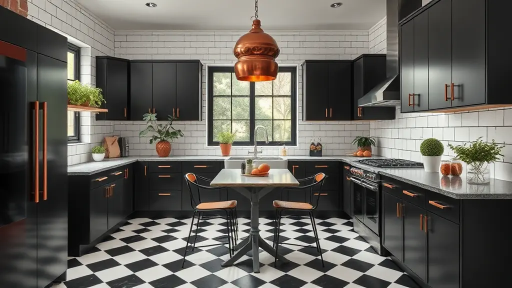 cuisine noir et carrelage noir et blanc